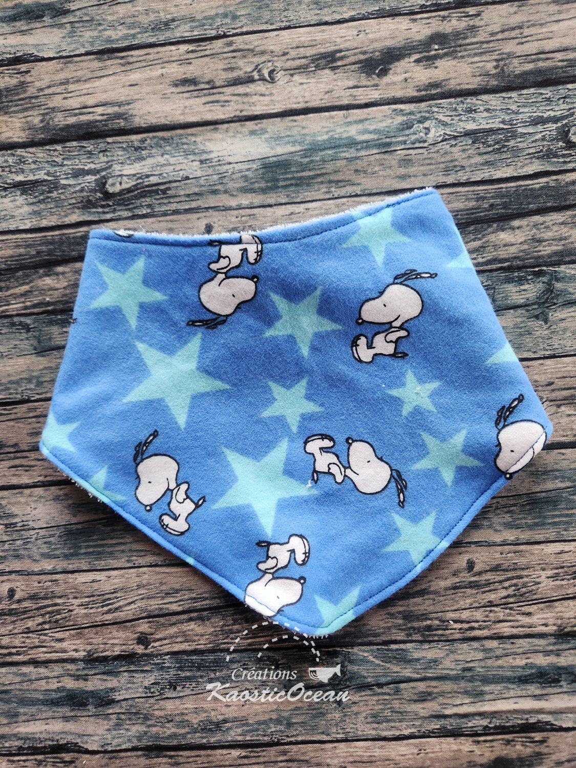 Bavoir pour bébés et jeunes enfants. Motif en flanelle avec envers en ratine douce et absorbante. S'attache avec un bouton-pression, avec 2 ajustements possibles.
