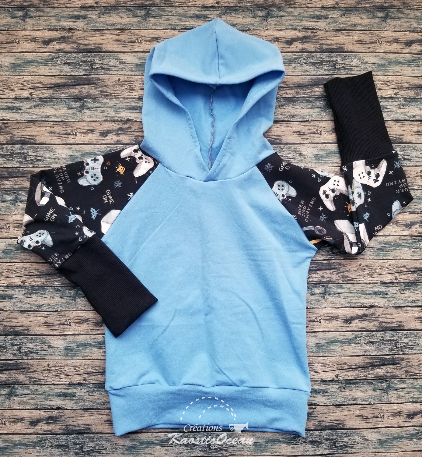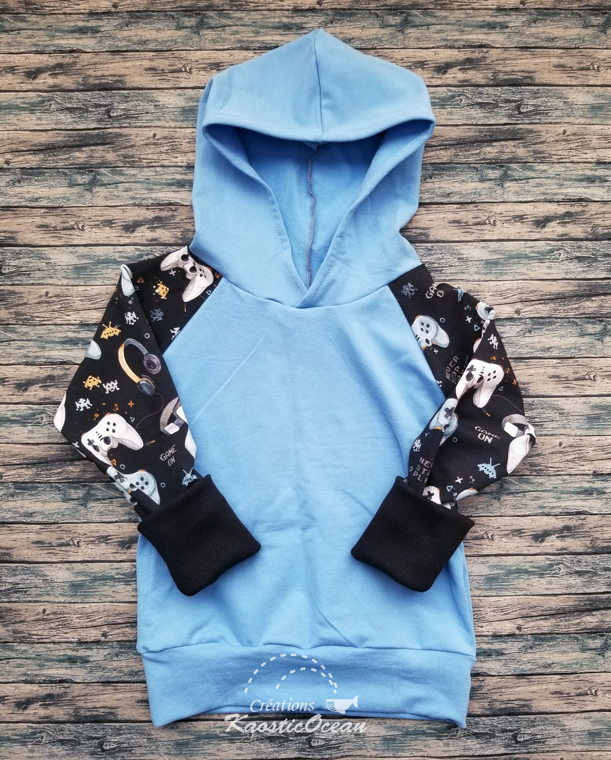 Chandail qui fait plus longtemps grâce aux bandes que l'on peut plier aux manches et à la taille. Avec un capuchon et des manches longues, c'est parfait pour les journées plus fraîches.