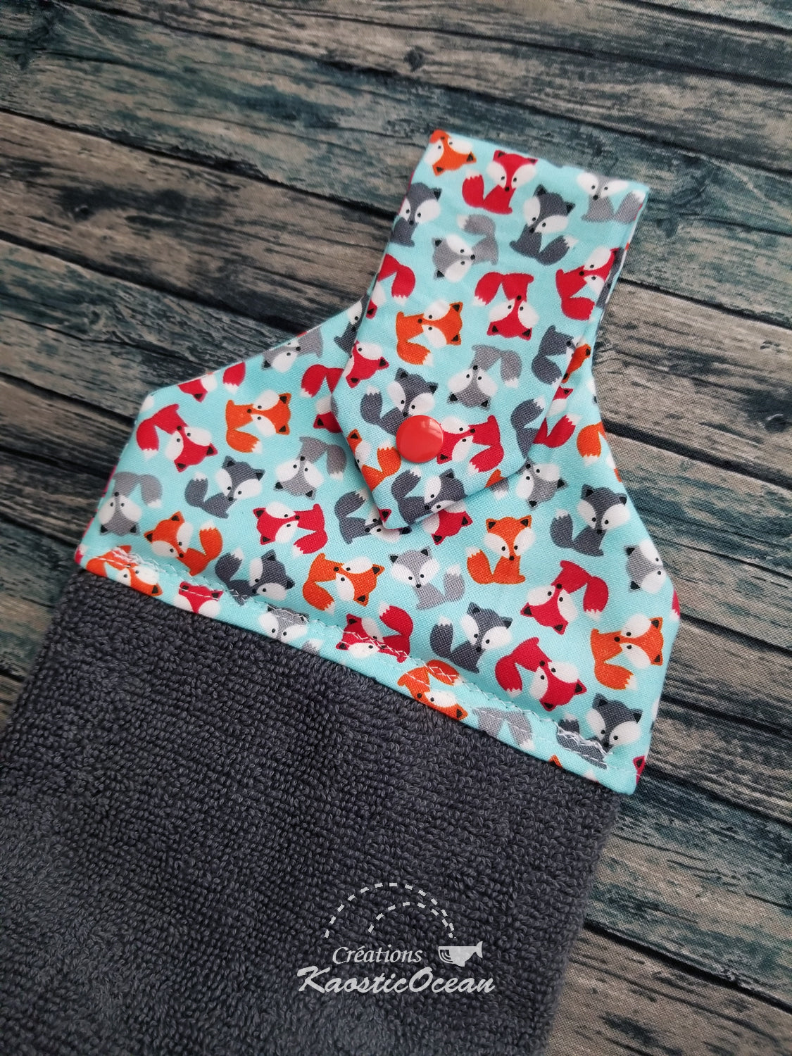 Serviette pratique qui s'attache avec un bouton pression. Parfait pour accrocher sur la porte du four de la cuisine ou le porte-serviette de la salle de bain.