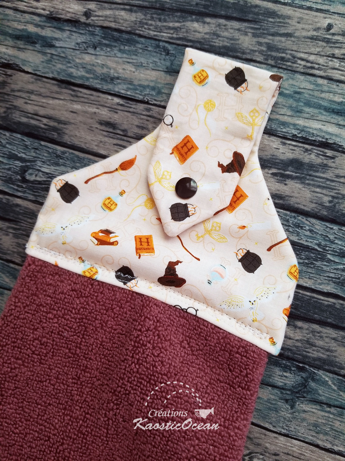 Serviette pratique qui s'attache avec un bouton pression. Parfait pour accrocher sur la porte du four de la cuisine ou le porte-serviette de la salle de bain.