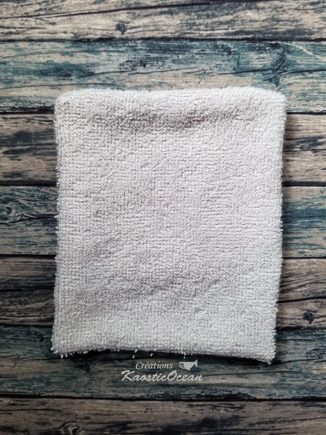 Débarbouillette sous forme de petite mitaine. Elle peut servir pour le bain des enfants ou comme lingette pour le visage. Tissus doux avec un côté en flanelle et l'autre en ratine de bambou.