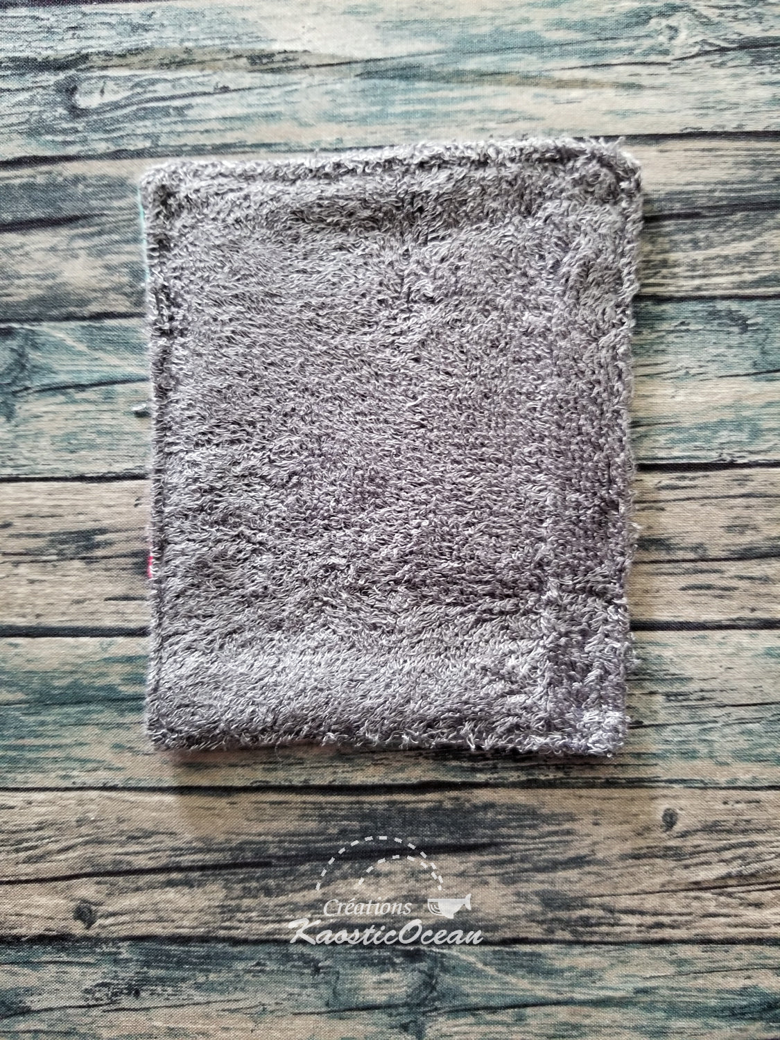 Débarbouillette sous forme de petite mitaine. Elle peut servir pour le bain des enfants ou comme lingette pour le visage. Tissus doux avec un côté en flanelle et l'autre en ratine de bambou.
