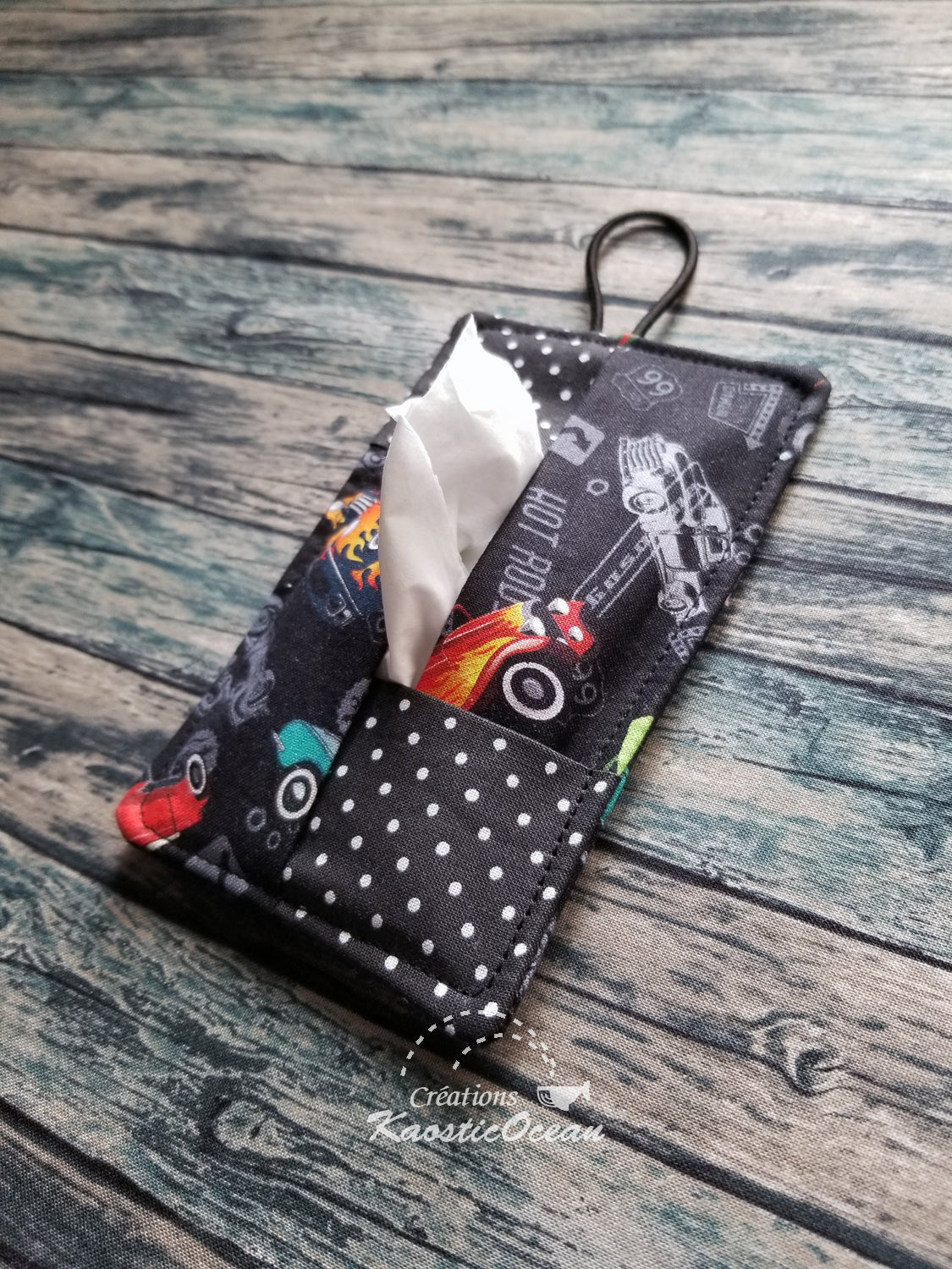 Pochette de transport pratique pour mouchoirs. Un élastique permet de l'accrocher partout. Elle peut contenir une dizaine de mouchoirs (voir la méthode de pliage dans les images).