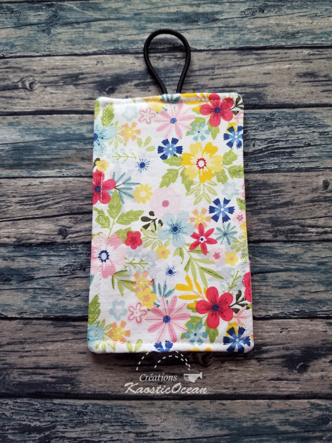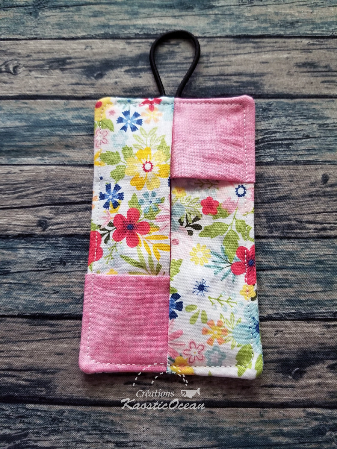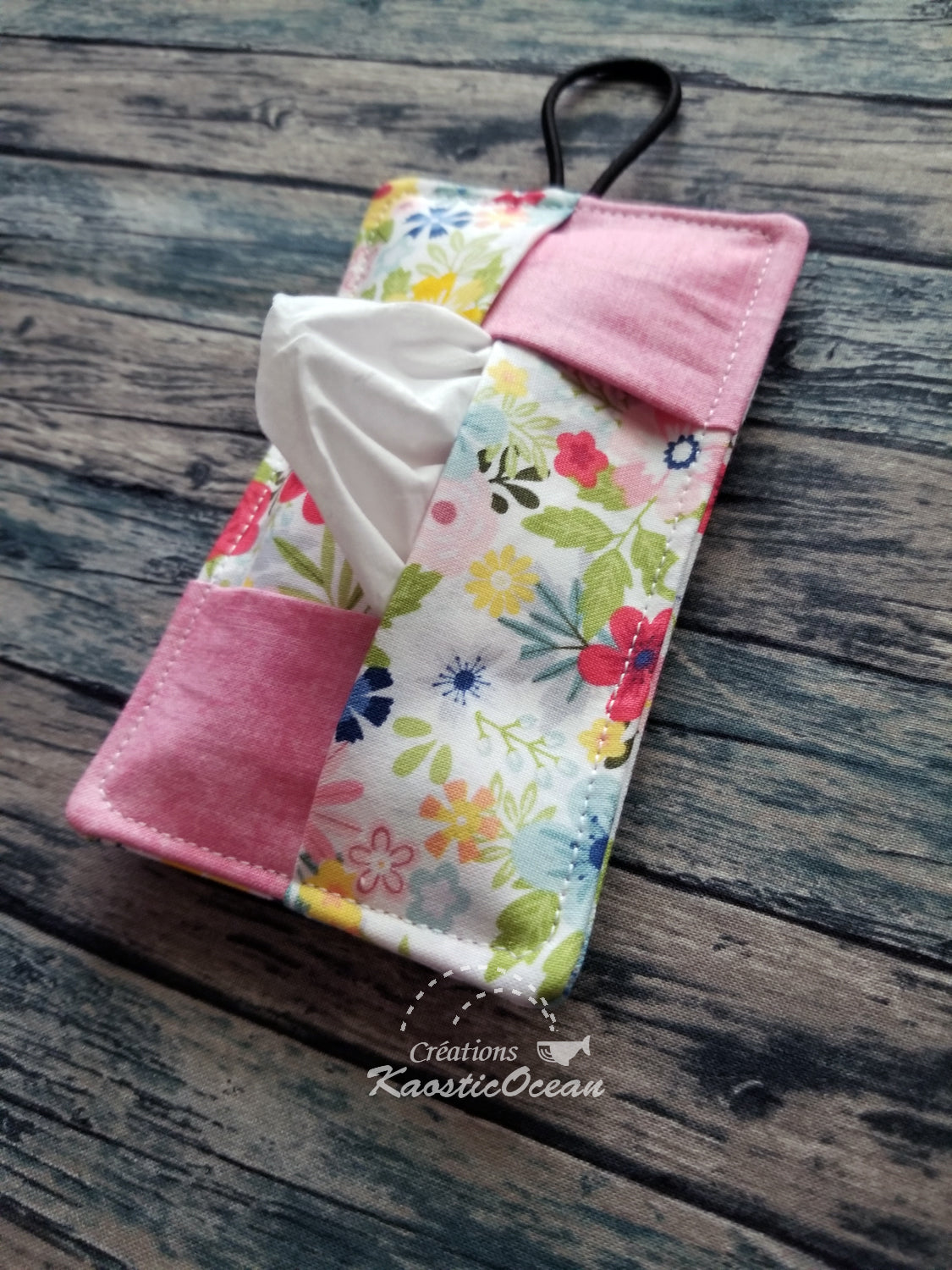 Pochette de transport pratique pour mouchoirs. Un élastique permet de l'accrocher partout. Elle peut contenir une dizaine de mouchoirs (voir la méthode de pliage dans les images).