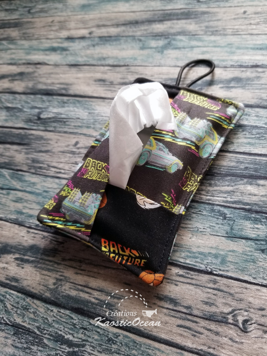 Pochette de transport pratique pour mouchoirs. Un élastique permet de l'accrocher partout. Elle peut contenir une dizaine de mouchoirs (voir la méthode de pliage dans les images).