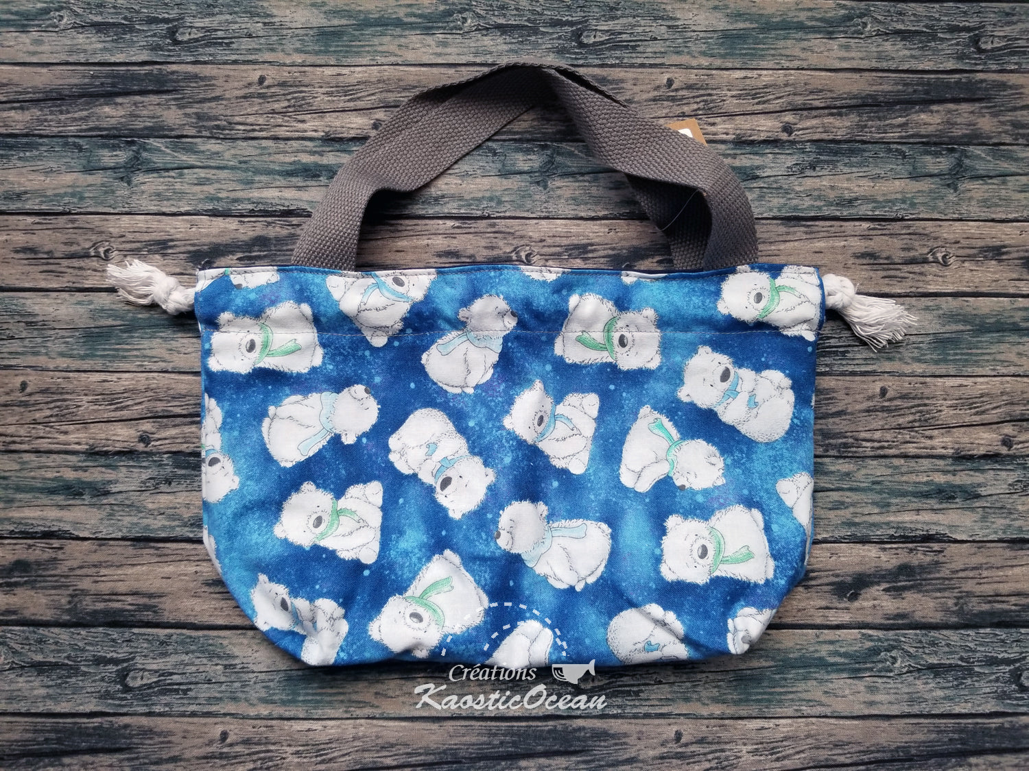 Petit sac réversible avec fermeture à coulisse. Pratique pour la collation à l'école, le rangement ou le transport de jouets ou comme sac cadeau.